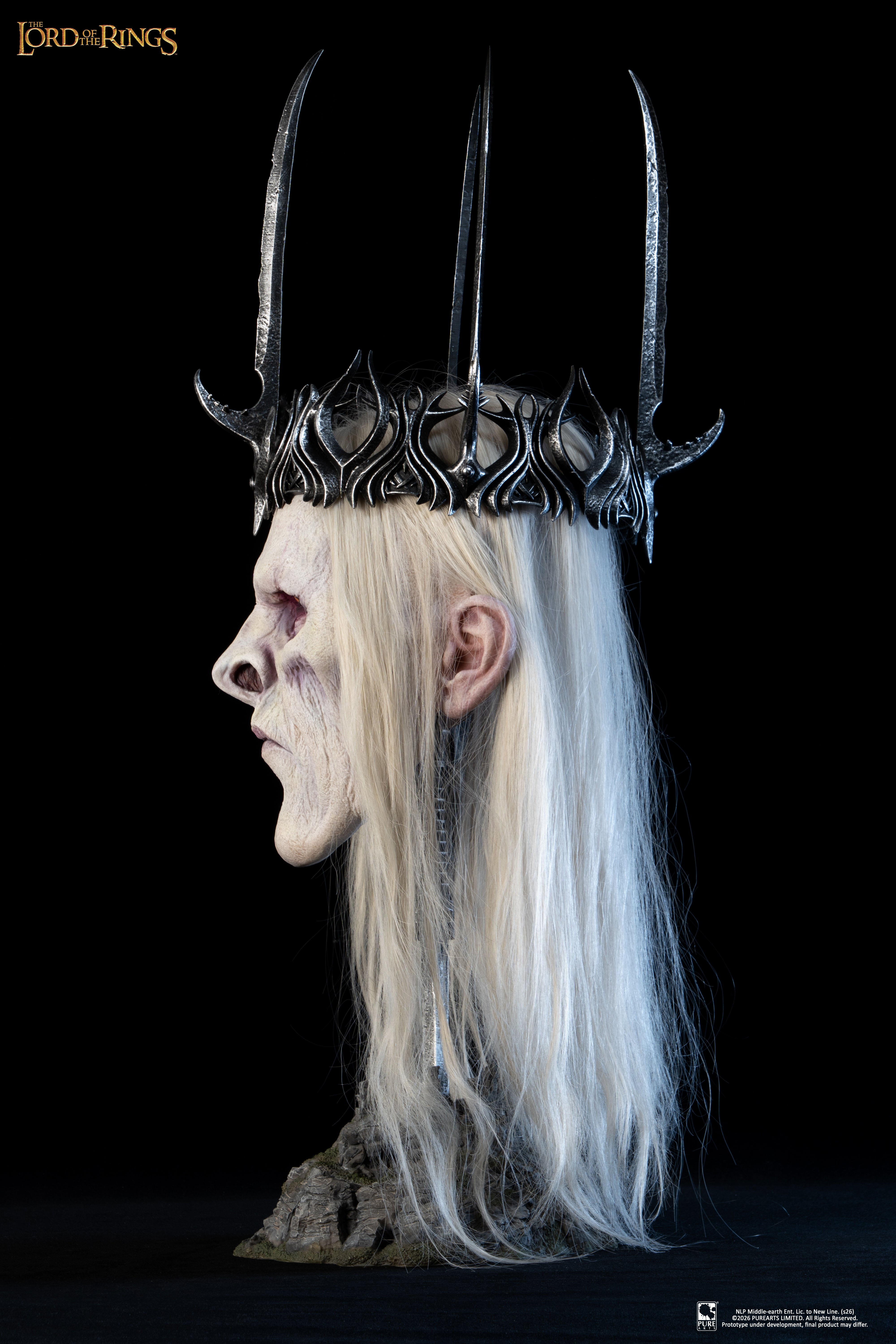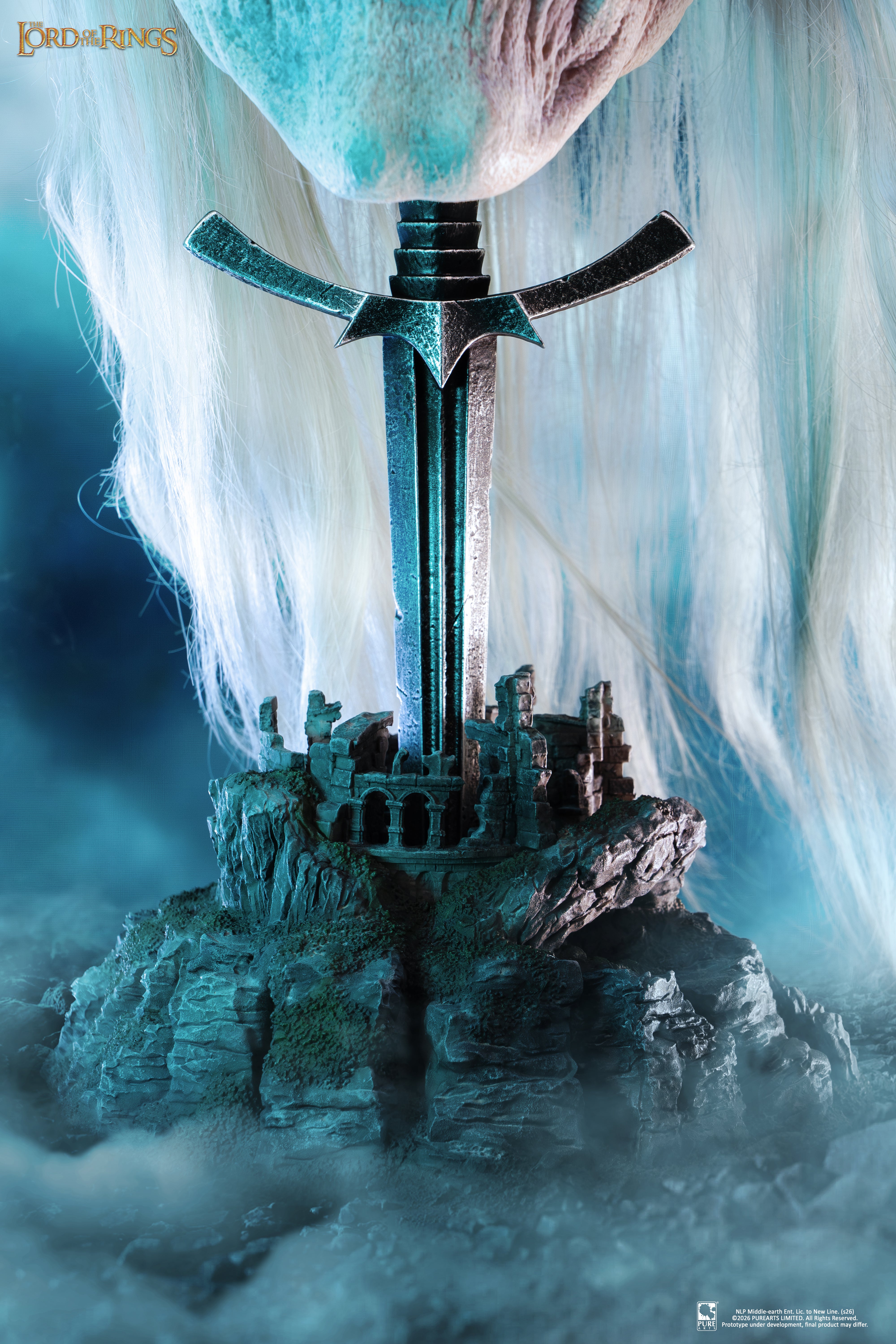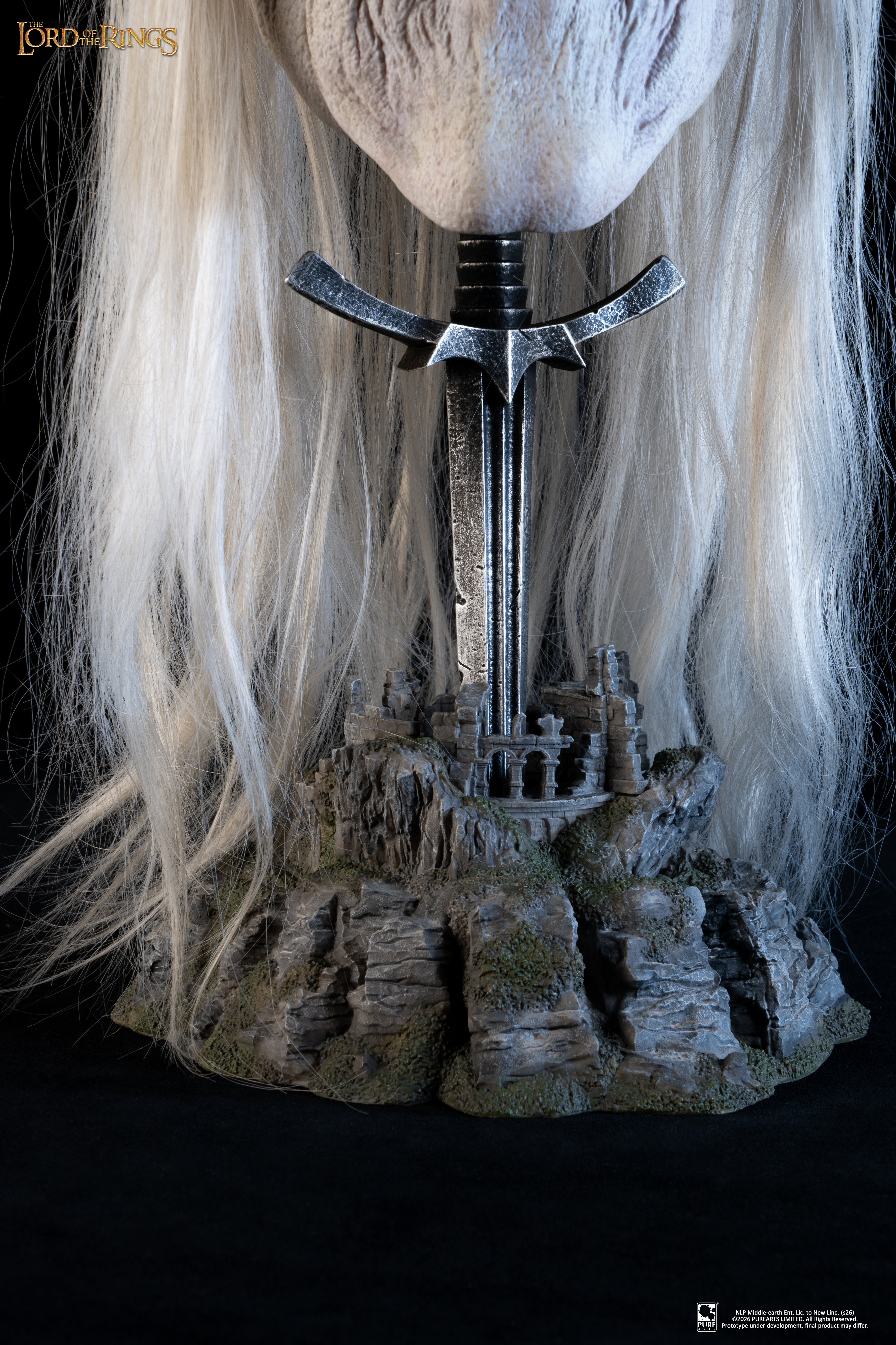 Crafted with exceptional realism, the mask features silicone skin, glass eyes, and individually hand-punched hair, delivering an unparalleled lifelike finish despite his wraithlike form. Every fold, texture and decaying detail has been meticulously sculpted to reflect his corrupted existence between worlds. The display support is designed as the Morgul blade planted into the castle ruins, recreating the dramatic moment of attack. A haunting centerpiece for collectors and fans of The Lord of the Rings.