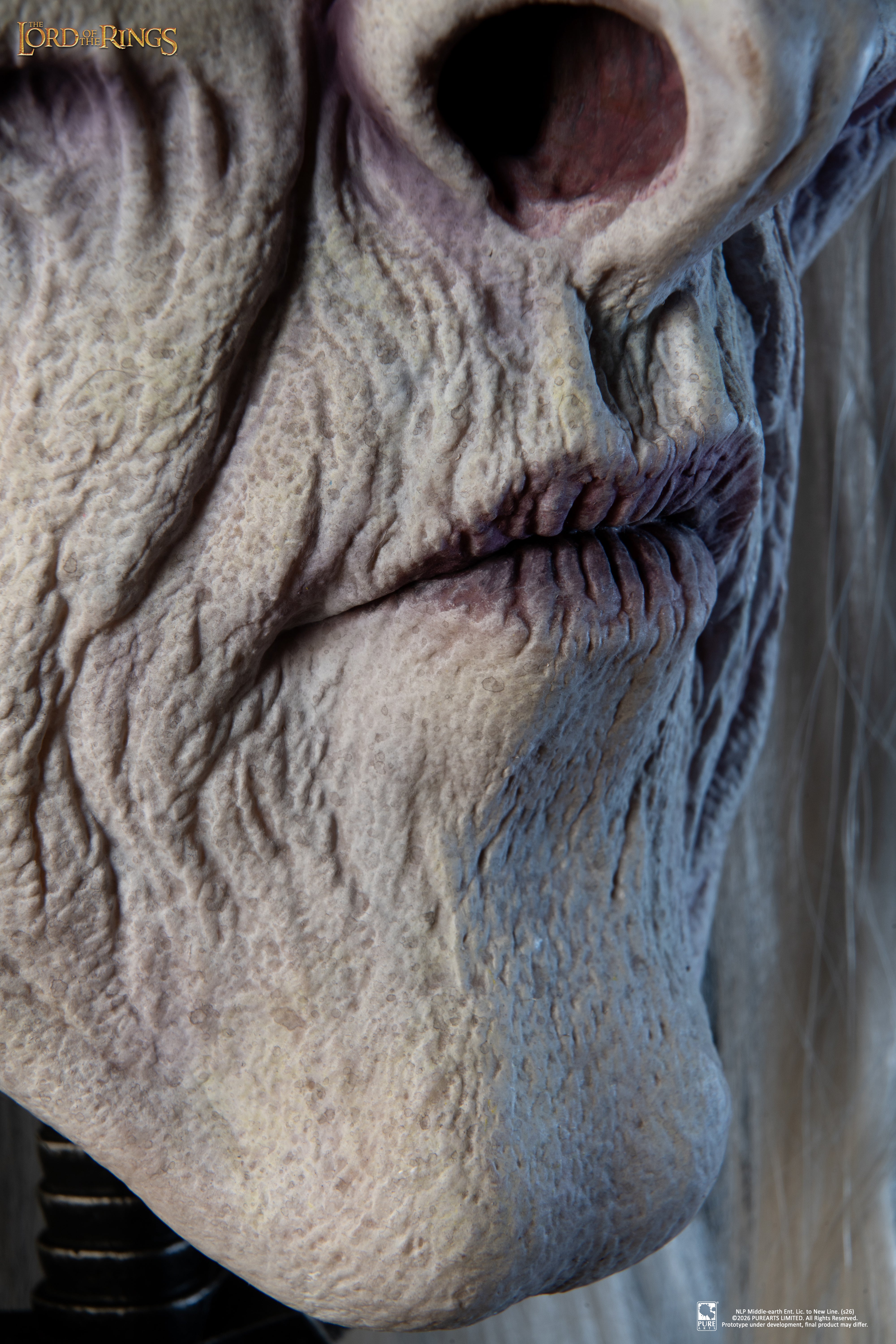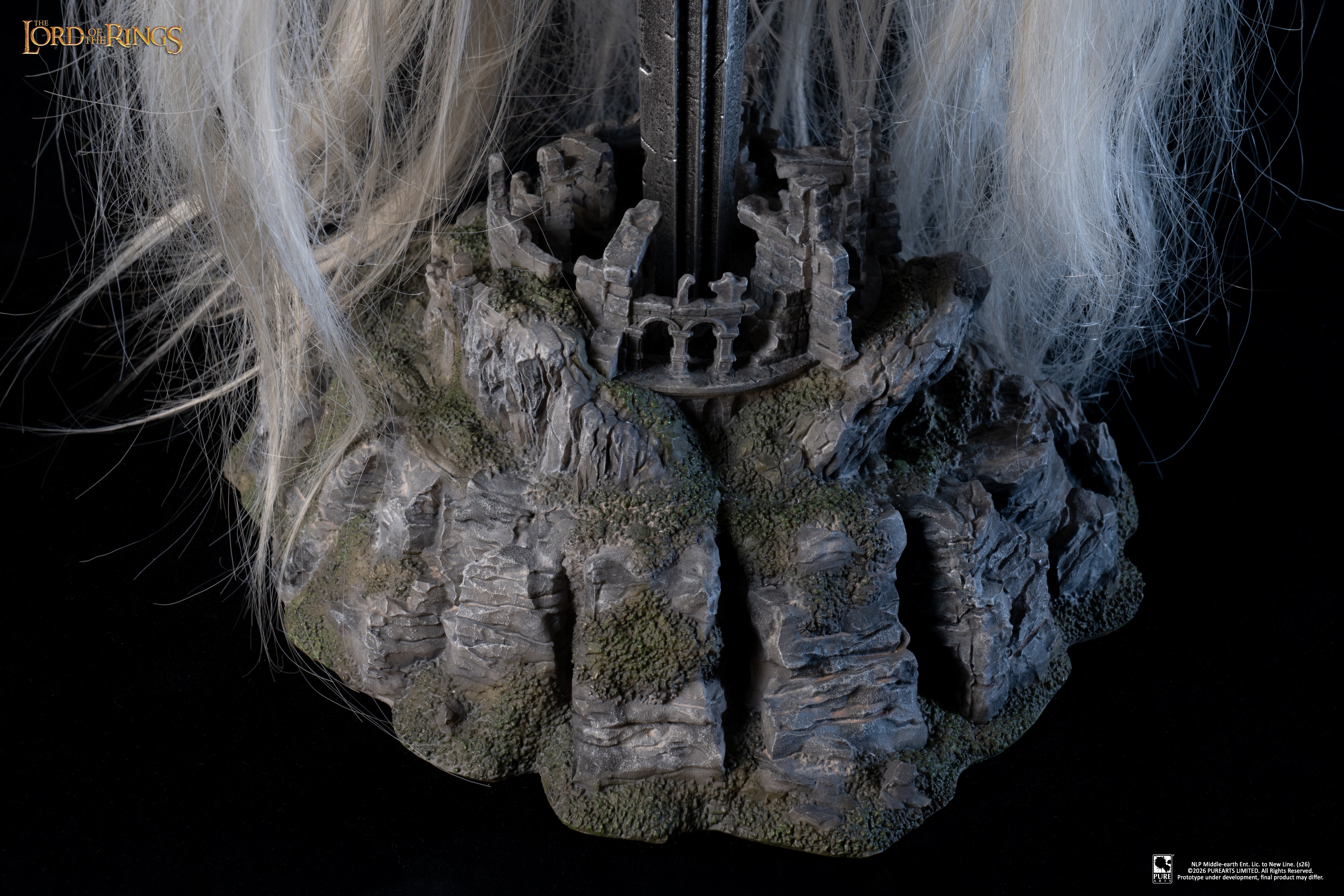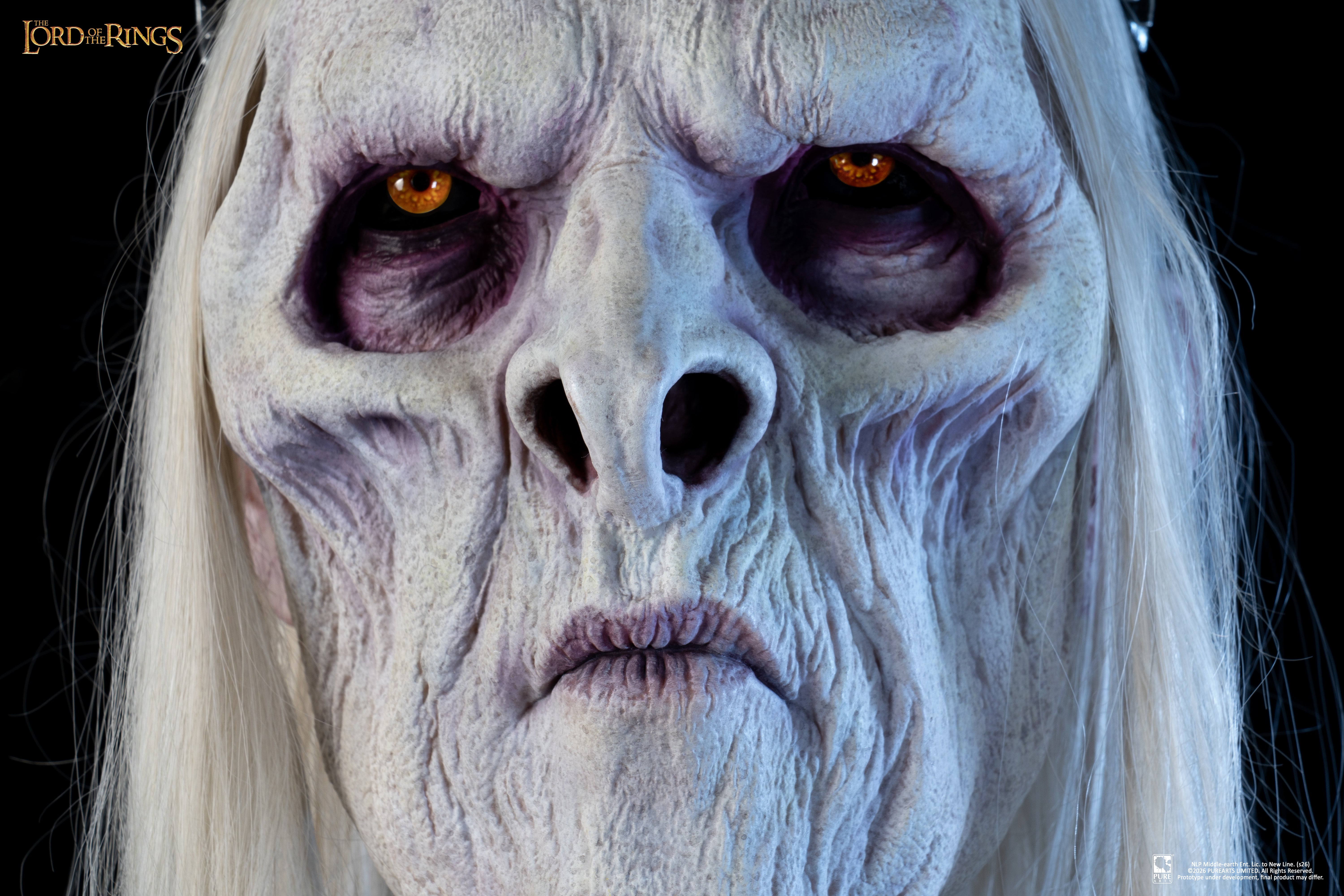 Crafted with exceptional realism, the mask features silicone skin, glass eyes, and individually hand-punched hair, delivering an unparalleled lifelike finish despite his wraithlike form. Every fold, texture and decaying detail has been meticulously sculpted to reflect his corrupted existence between worlds. The display support is designed as the Morgul blade planted into the castle ruins, recreating the dramatic moment of attack. A haunting centerpiece for collectors and fans of The Lord of the Rings.