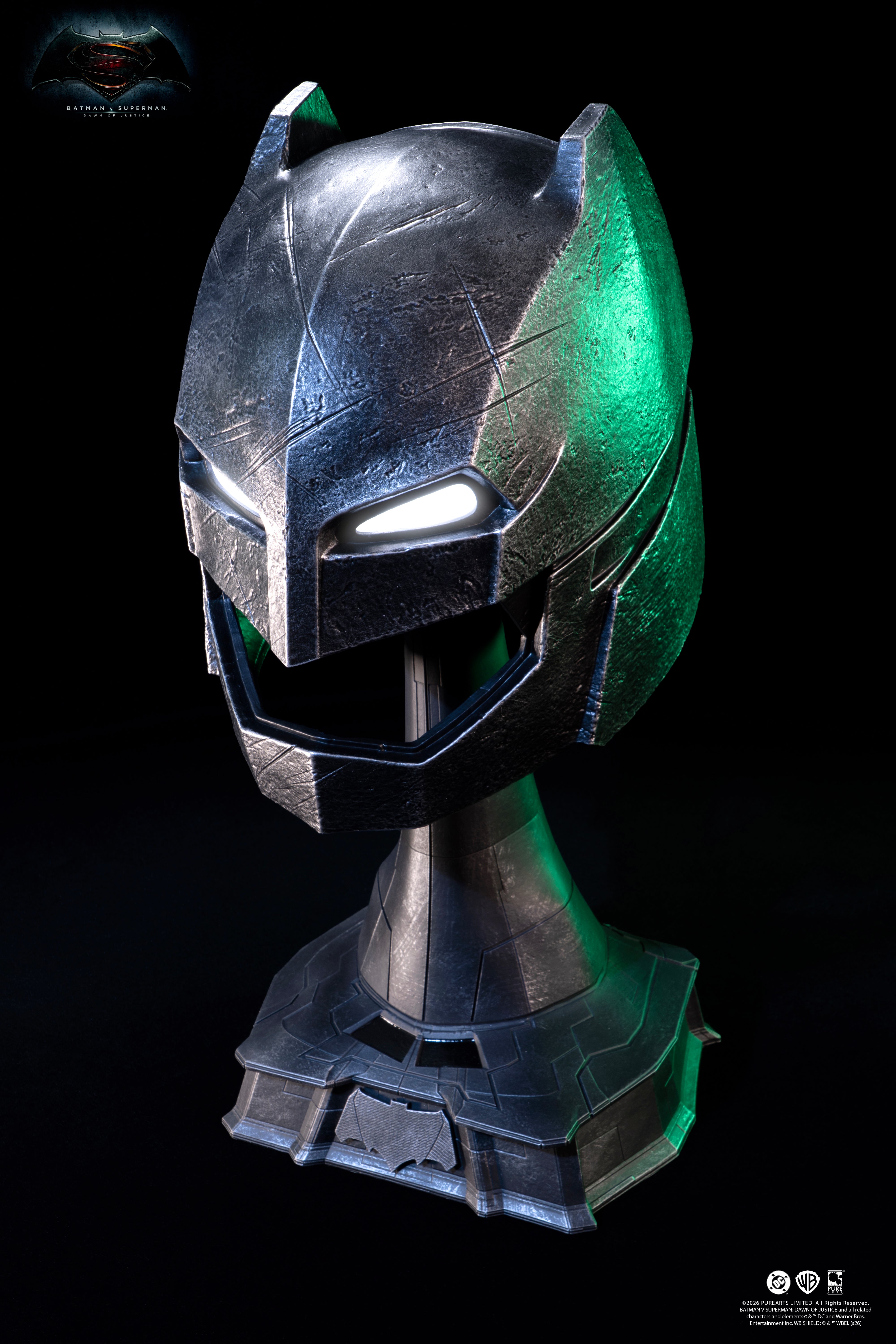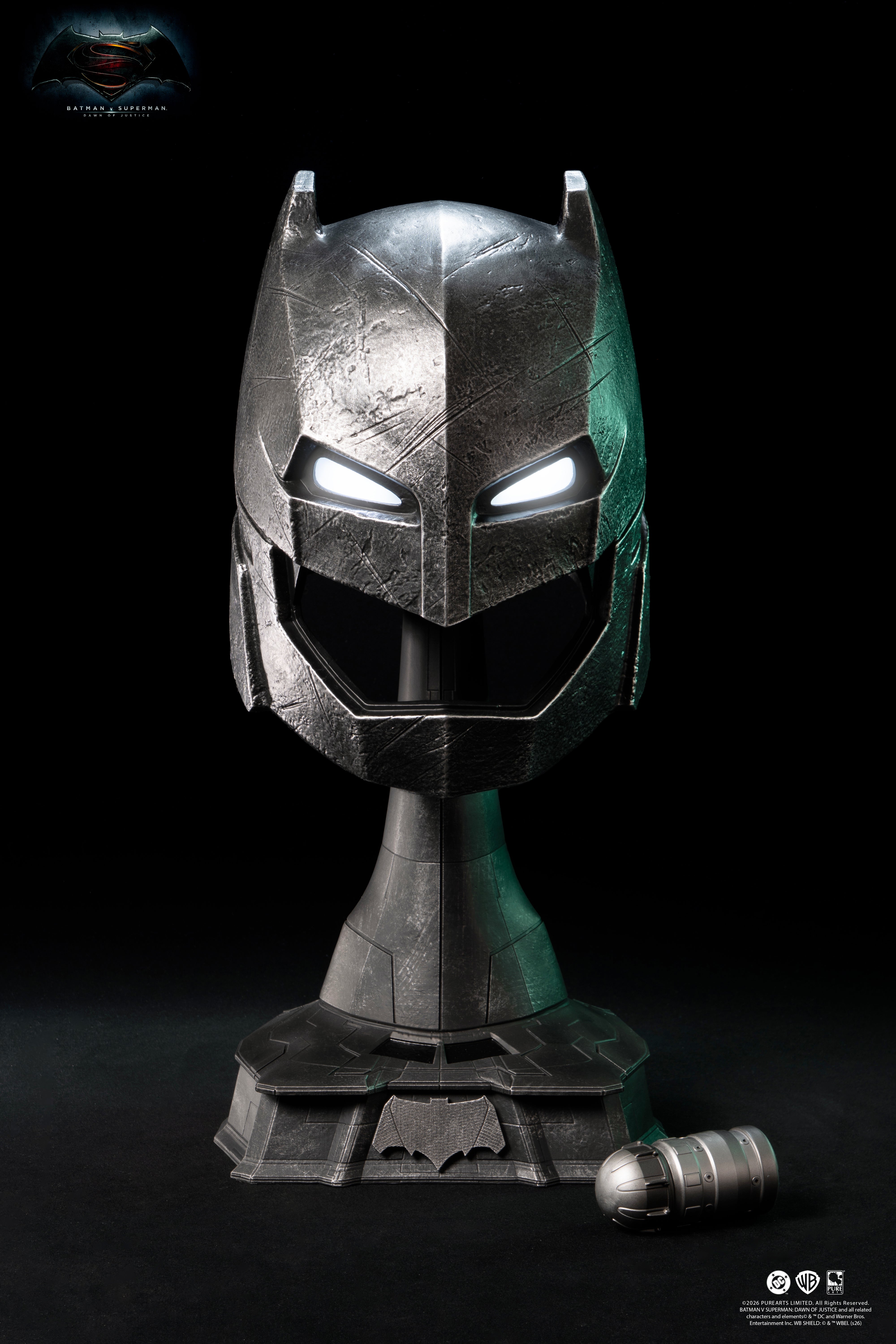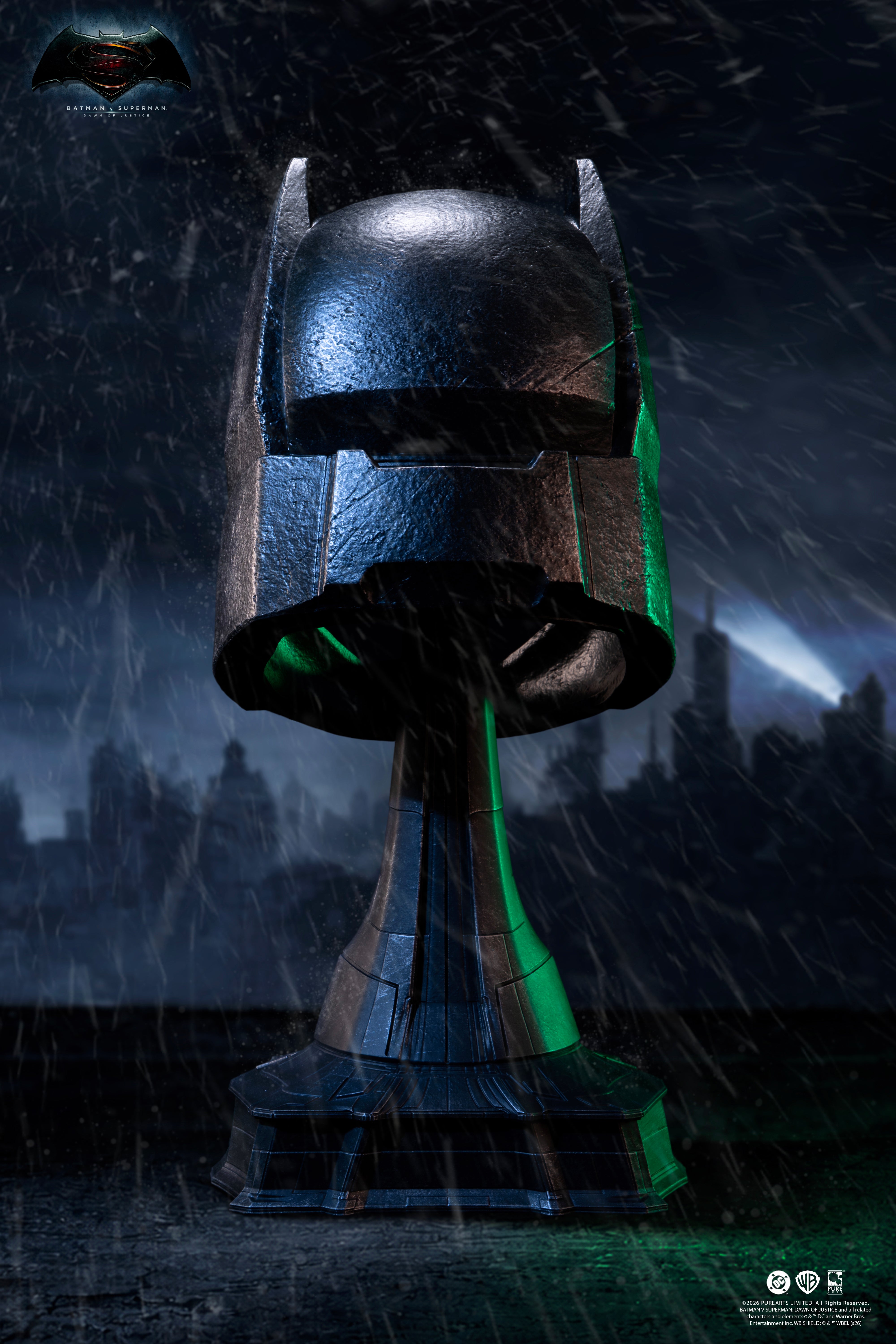 - Hyperdetailed sculpt of the armored Batman helmet, faithfully recreated from Batman v Superman