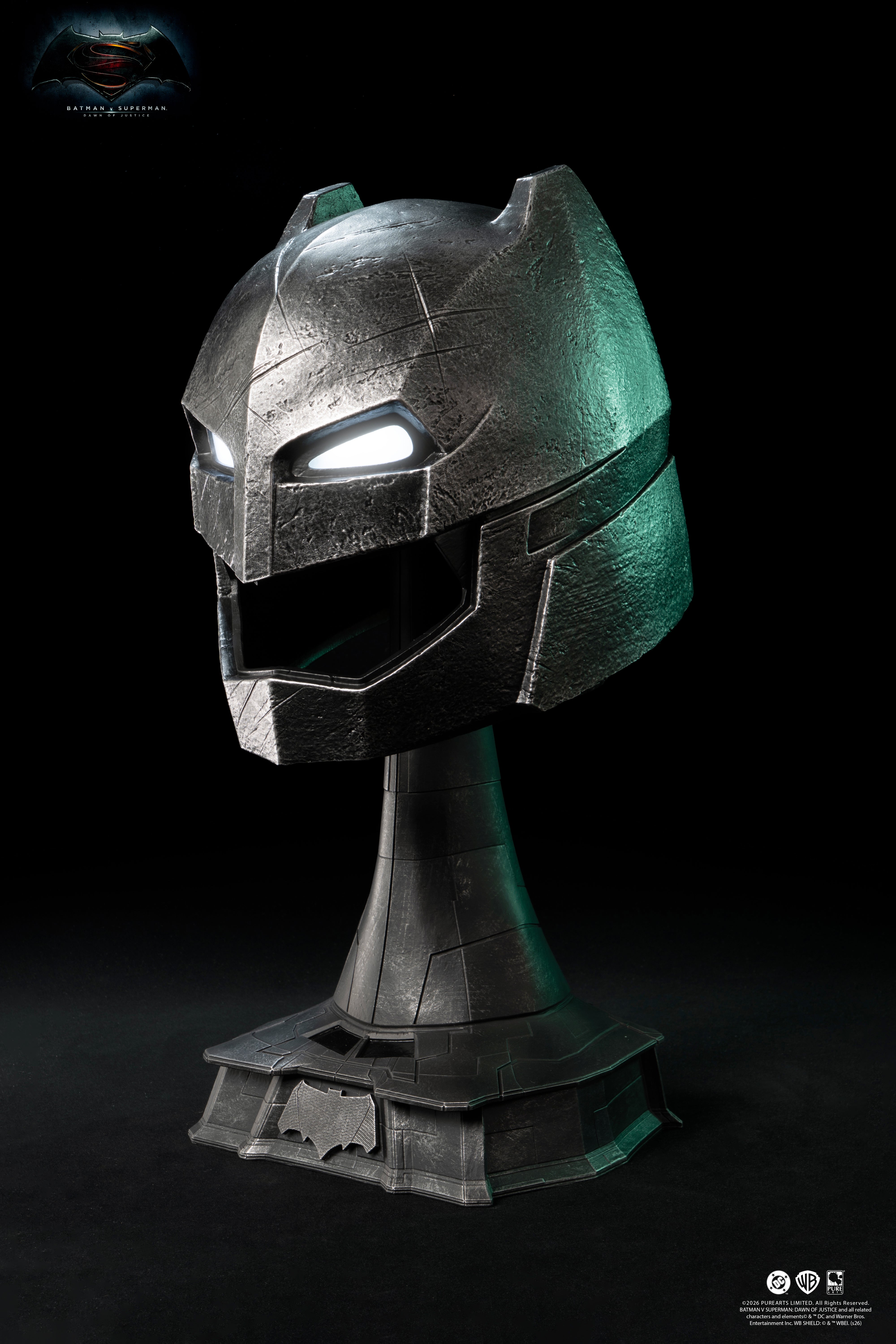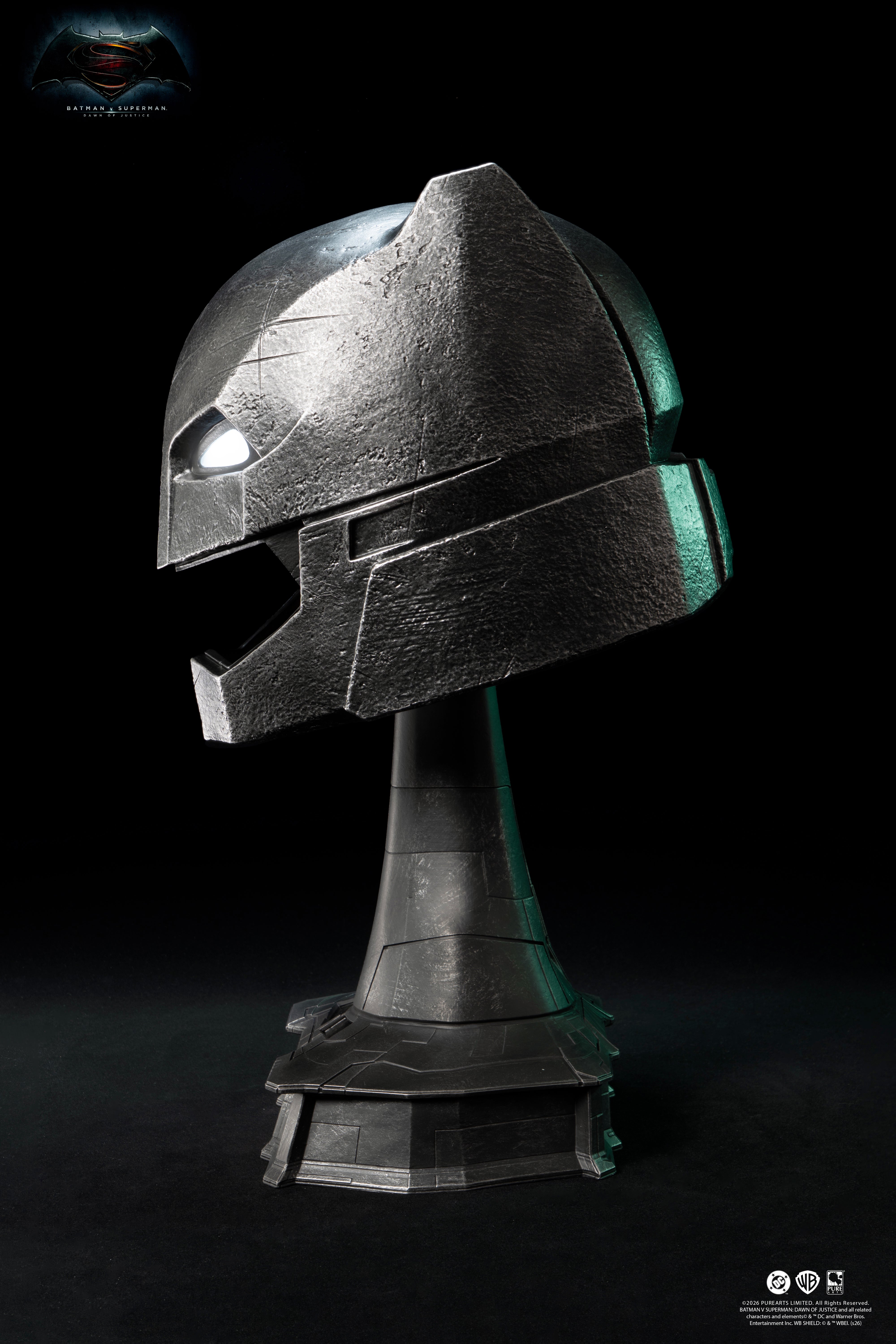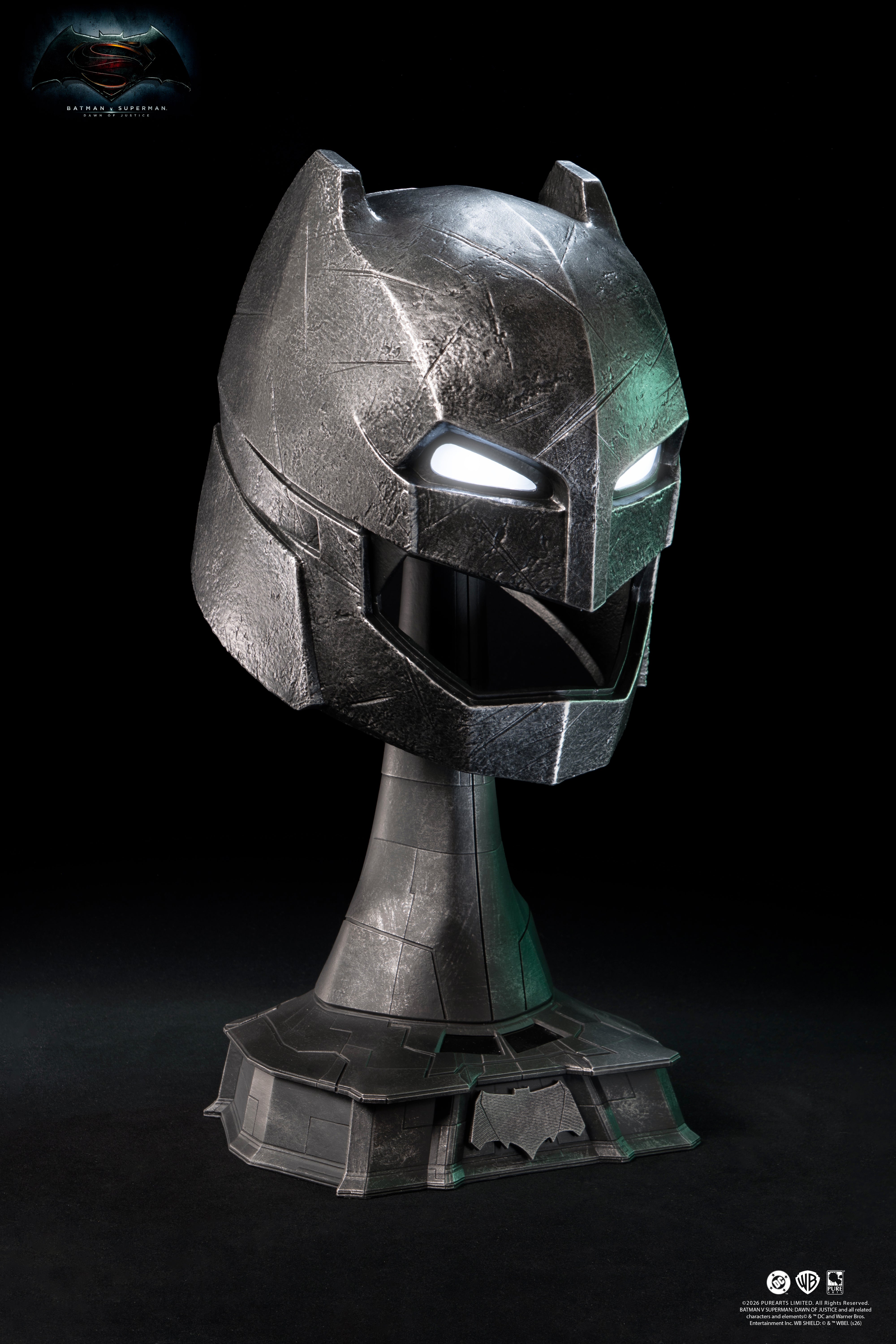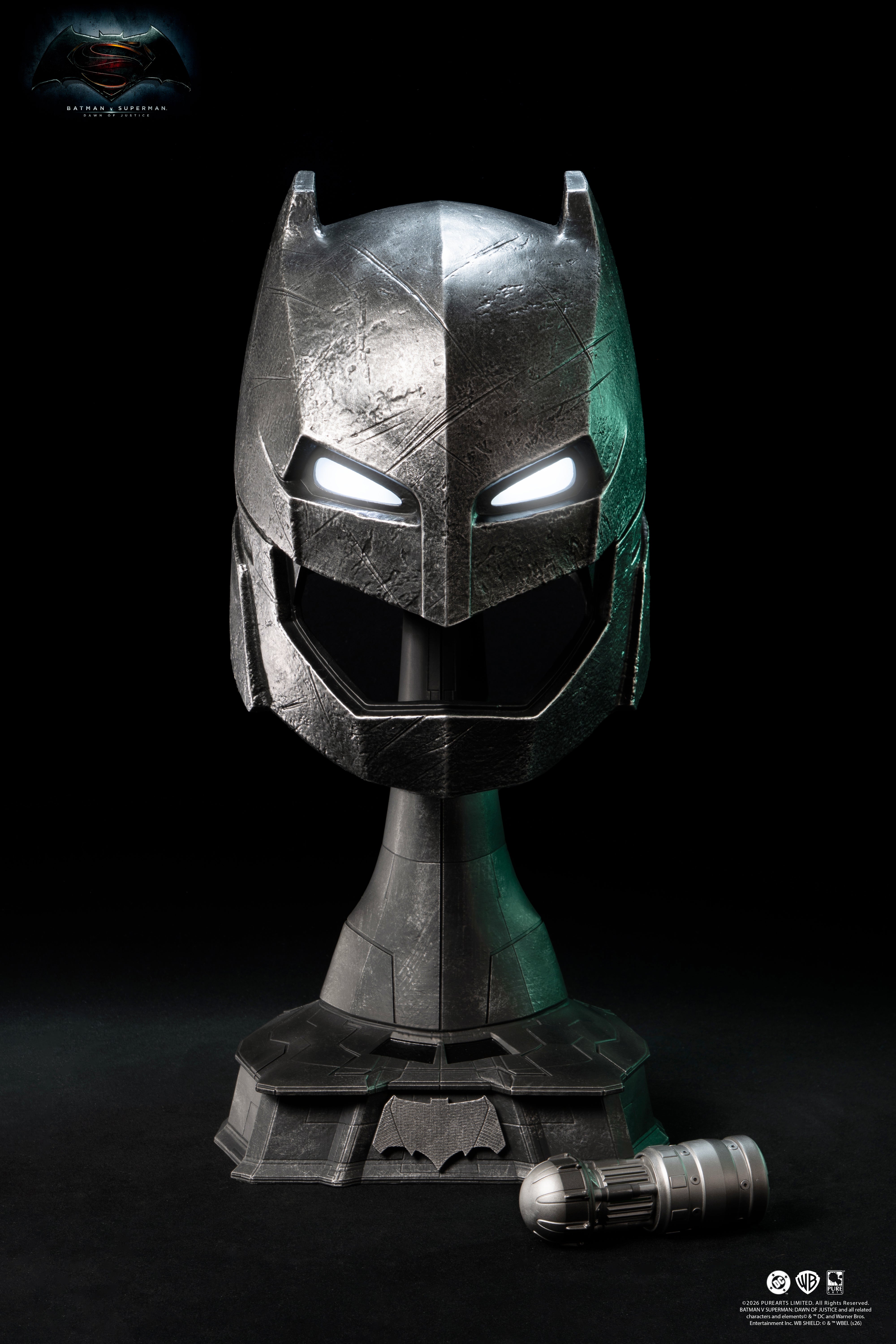 - Hyperdetailed sculpt of the armored Batman helmet, faithfully recreated from Batman v Superman