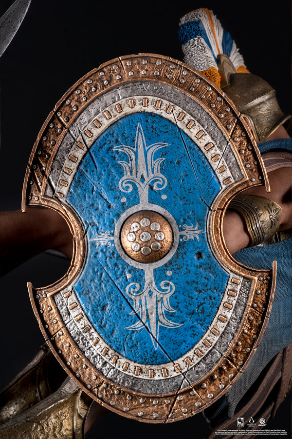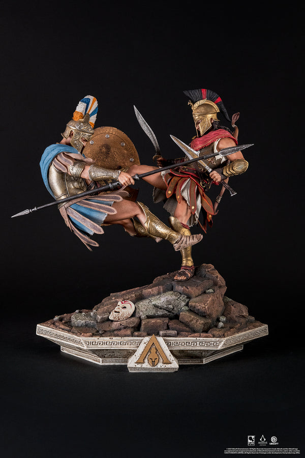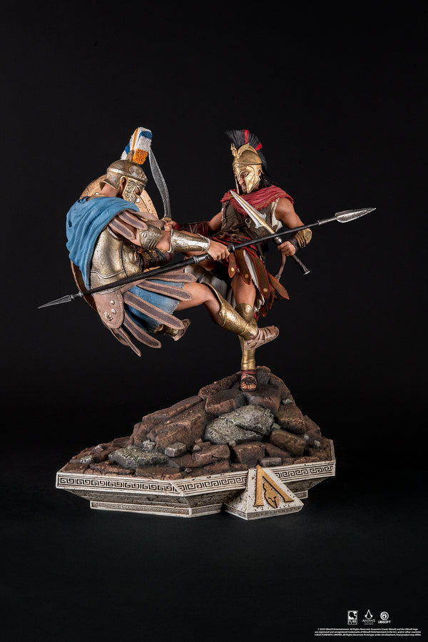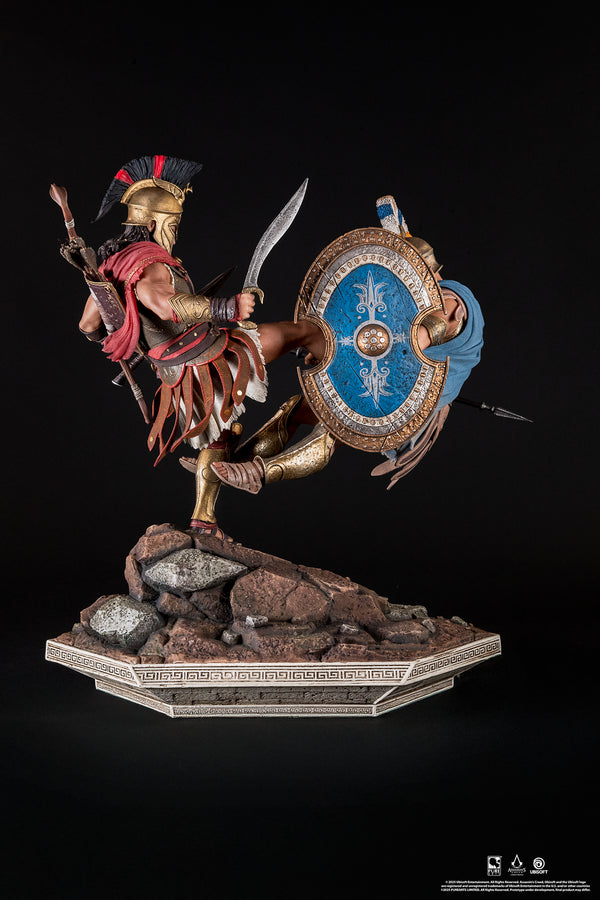 PureArts vous transporte dans l'univers d'Assassin's Creed Odyssey avec le diorama Assassin's Creed Spartan Kick à l'échelle 1/6, réalisé avec brio. Alexios exécute son emblématique coup de pied spartiate contre un commandant athénien, le projetant dans les airs. Vêtu de sa tenue de mercenaire fidèle au jeu, Alexios pose son pied gauche sur un terrain accidenté, brandissant sa lance brisée d'une main et son kopis de l'autre. Le logo doré d'Assassin's Creed Odyssey orne le socle inspiré de l'architecture grecque antique.