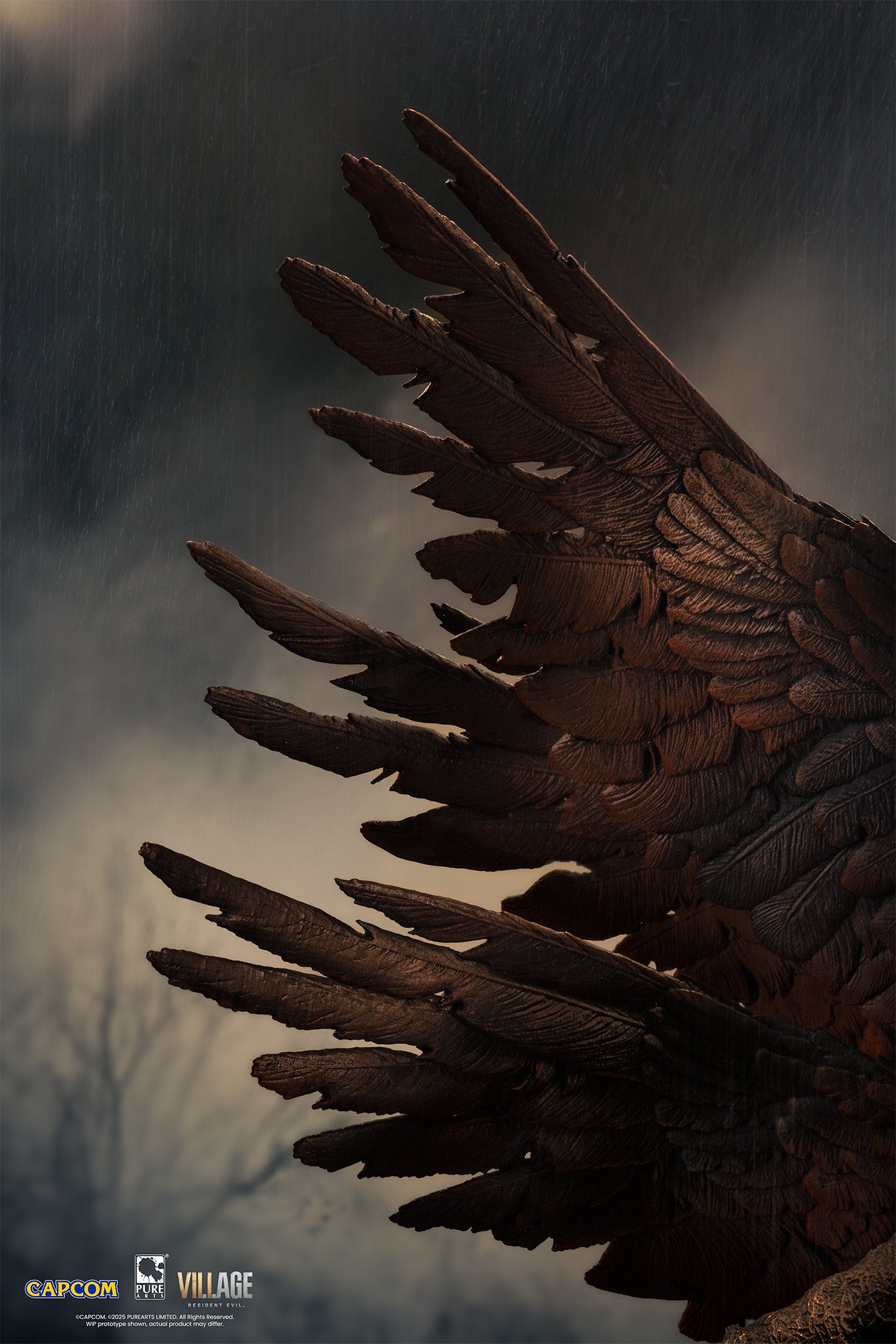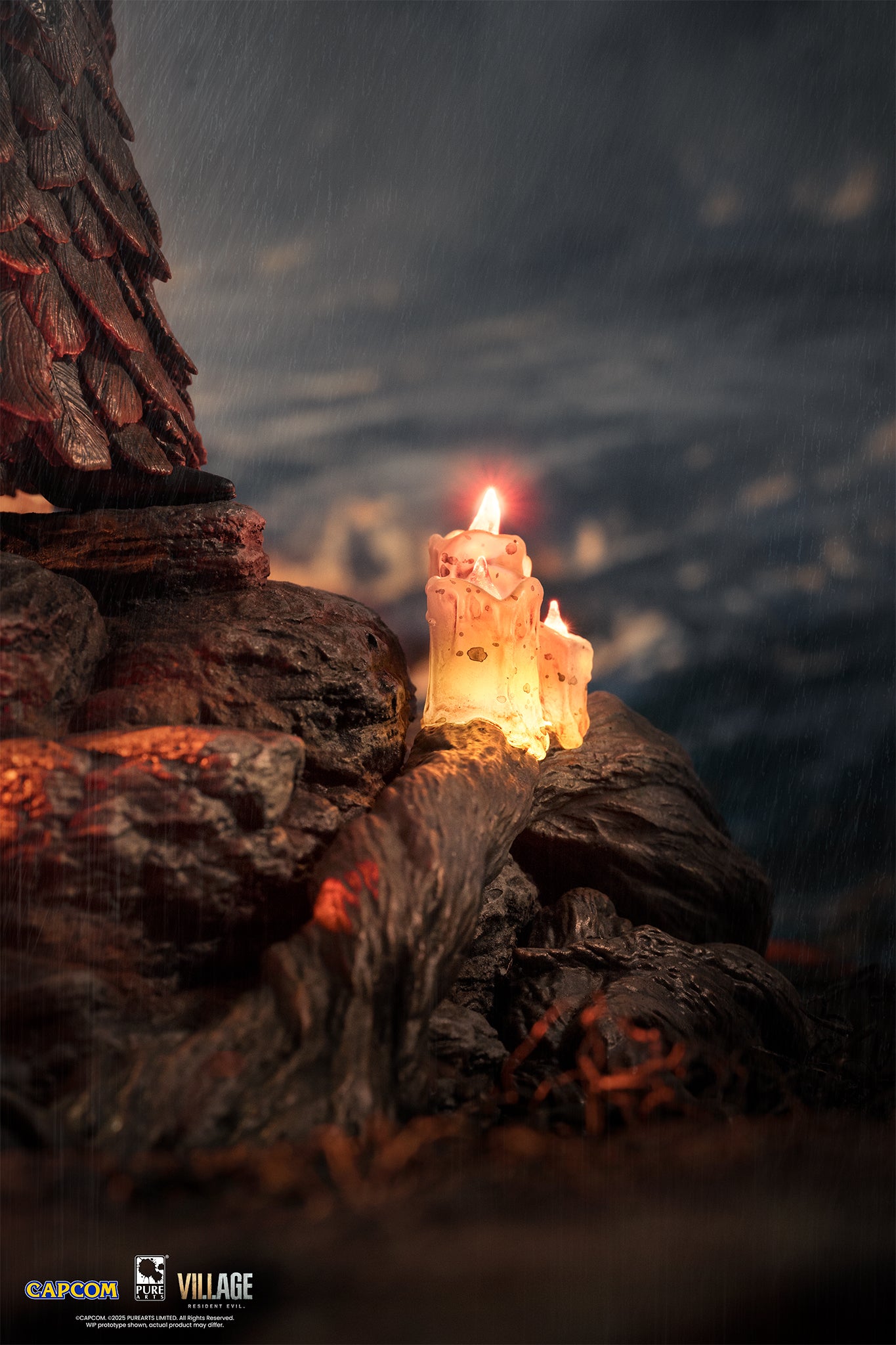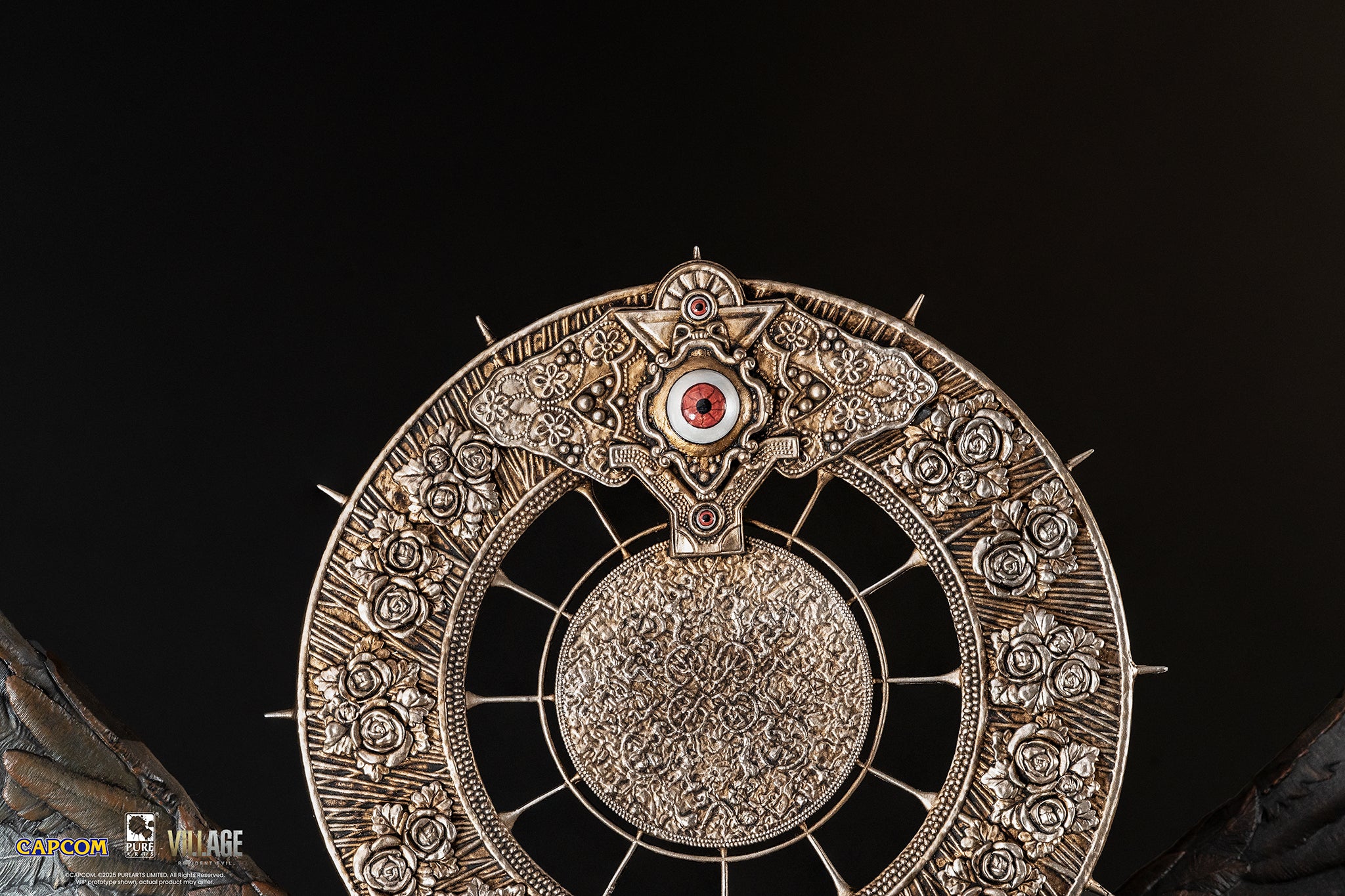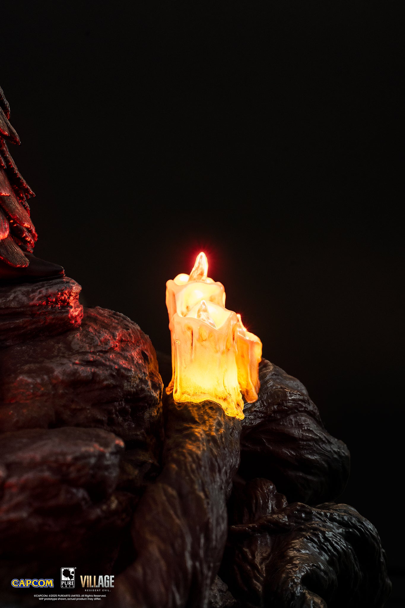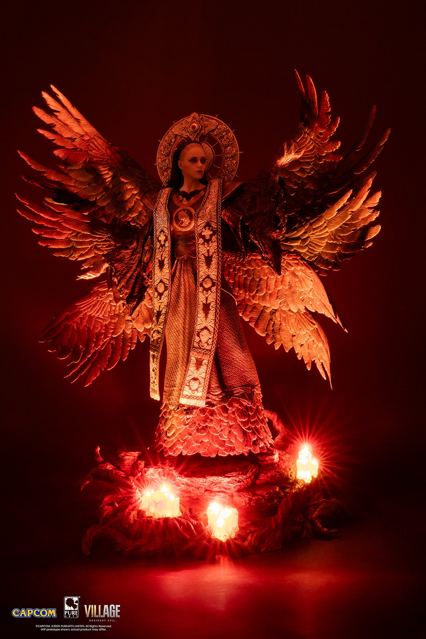 La cheffe de secte, biologiste et super-vilaine de Resident Evil Village est représentée avec un niveau de détail époustouflant ! Ses six ailes majestueuses sont déployées, son halo doré et sa robe savamment sculptée évoquent la divinité. Se dressant gracieusement sur un socle en pierre détaillé, orné des tentacules de la moisissure qui l'a infectée, Mère Miranda peut être exposée avec ou sans son masque doré. Des bougies LED scintillent à ses pieds, accentuant l'aura menaçante qu'elle dégage.