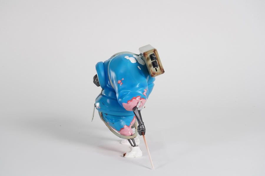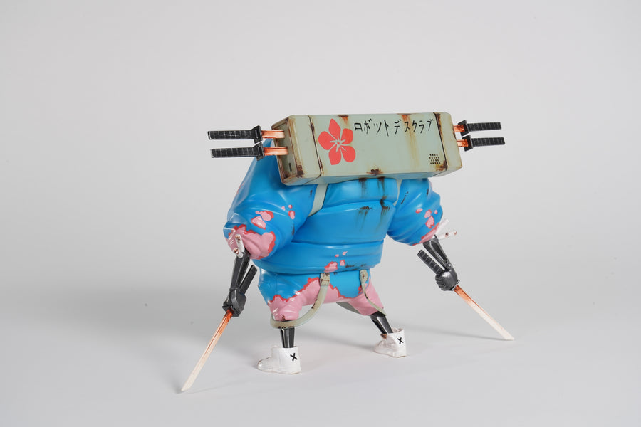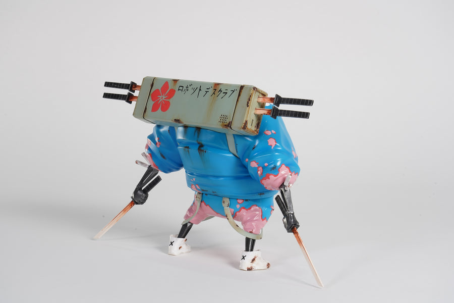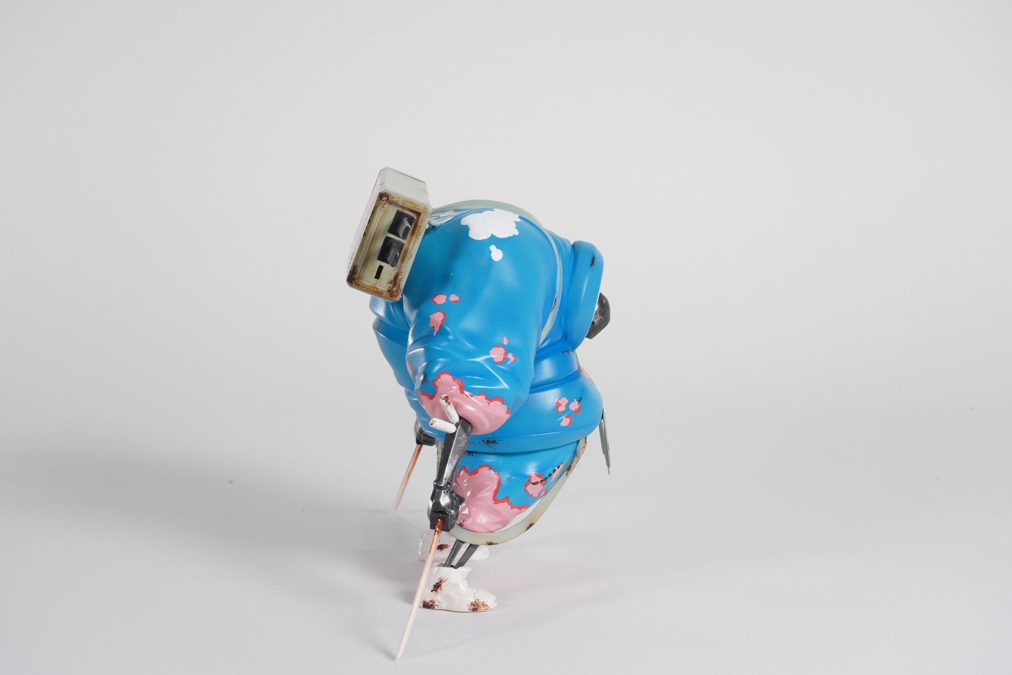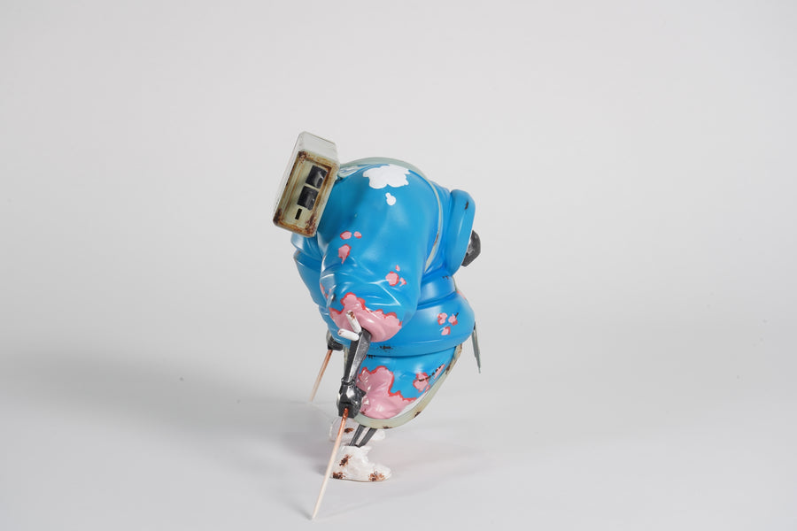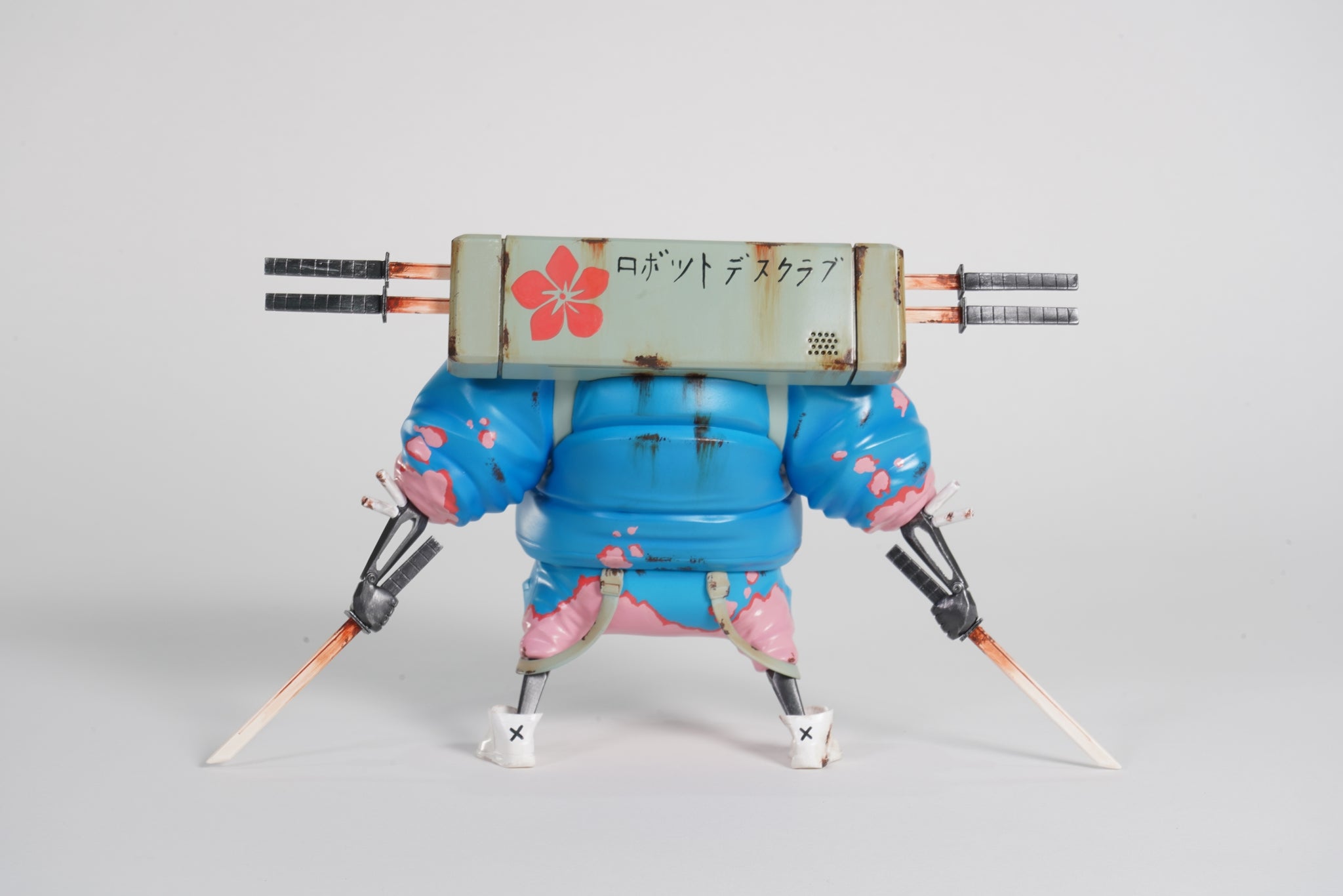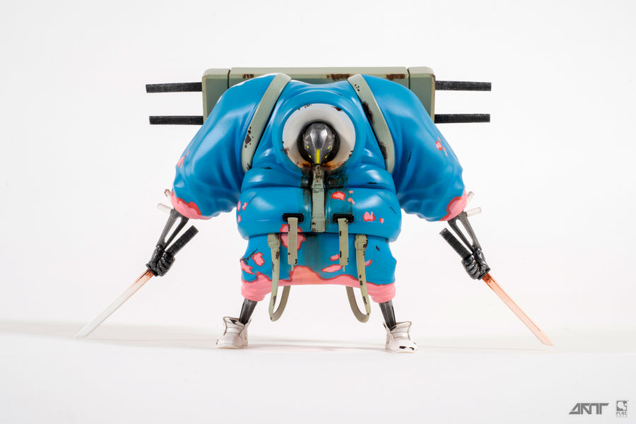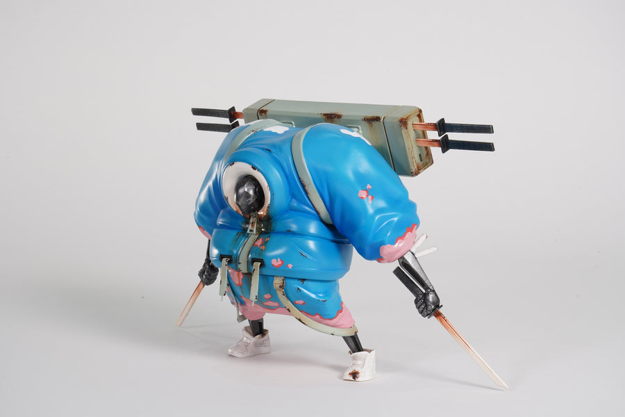 Designed by KLAV9 and Produced by PureArts & Smeye World on the Platform M9E by Daytoner, this 4 way collaboration has birthed a ferocious warrior. Armed with removable swords, this killer 1/12th scale Urban Vinyl figure is inspired by Akira Kurosawa’s Samurai Films where we can almost always see a duel with Cherry blossoms falling. The beautiful pattern and paint scheme on M9E's jacket is a classic style used by Kow Yokoyama on his Maschinen Krieger Models in the 1980s, which was borrowed from German WW2 airplanes. KLAV9 even brought seamlessly Mt Fuji on the jacket with his cloud pattern.